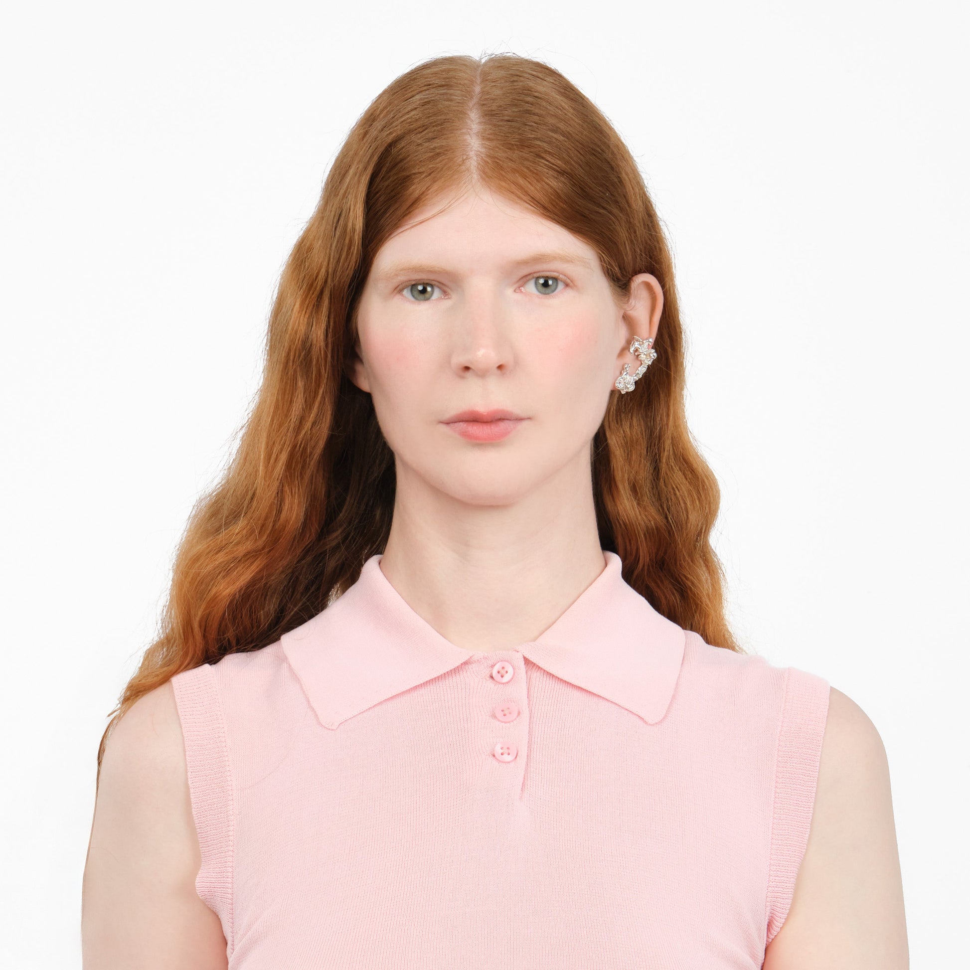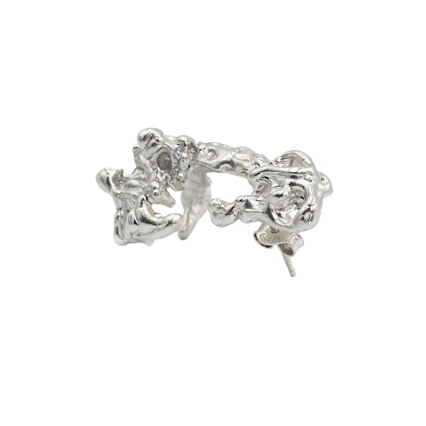A vibrant, organic-shaped unisex silver ear cuff in a hybrid design with an earring. It features two points of support and attachment. Piercing required. Its weight is comfortable for all-day wear.