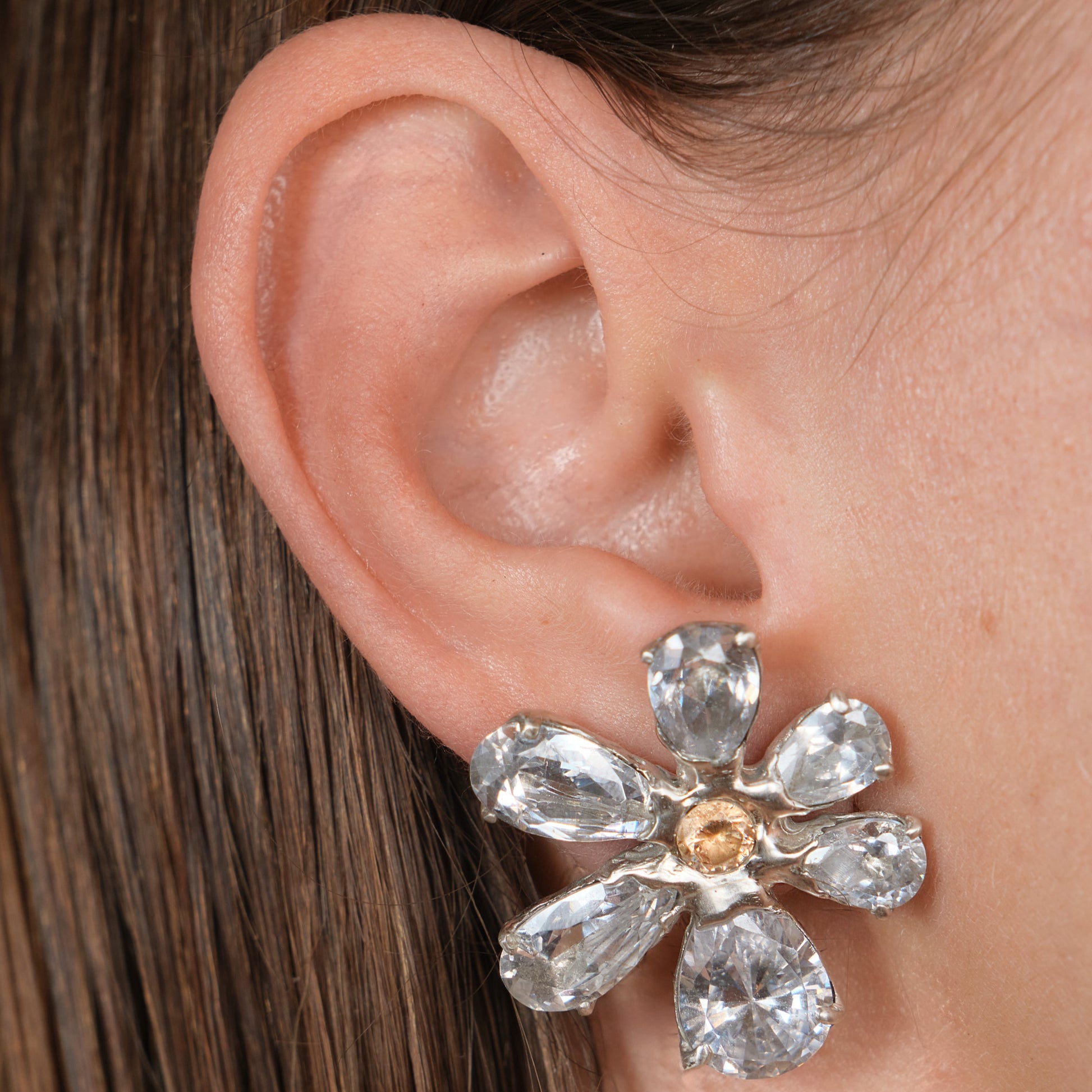 Chamomile clip-on earring ring made of sterling silver body featuring pear shape zirconias and a champagne zirconia in the center forming a flower. From the SS25 collection.