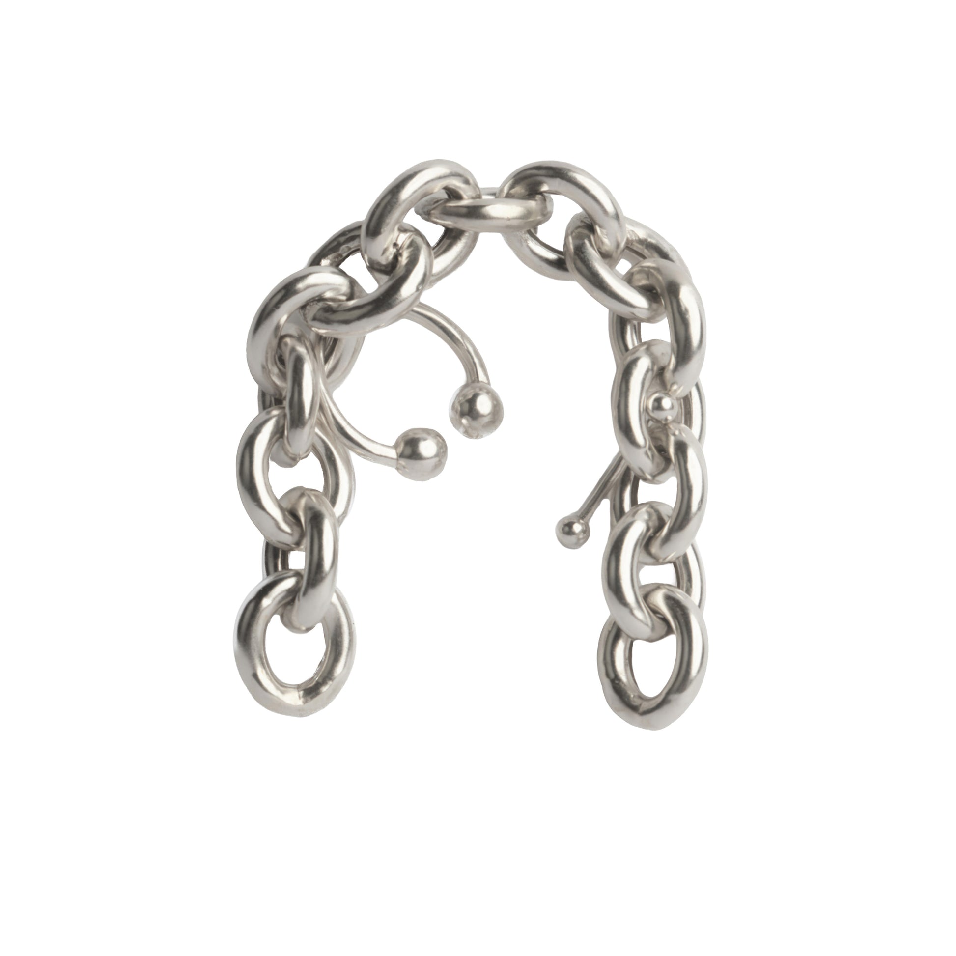 The silver massive chain arc earring with piercing is bold yet lightweight. Wear it as a statement piece or pair it with its matching massive chain siblings: the NSST08 necklace and the BSST08 bracelet.
