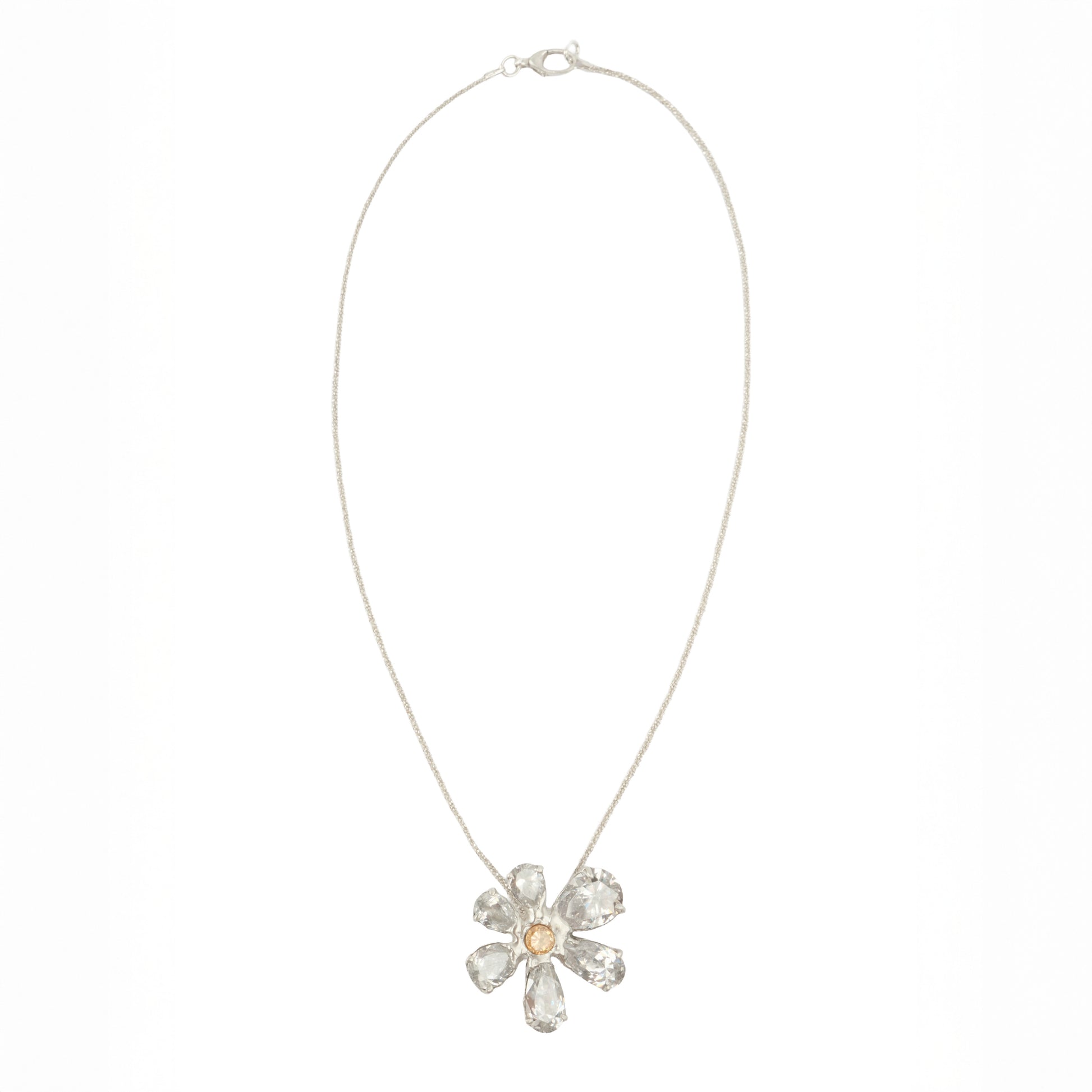 Sterling silver chain featuring a flower-shaped object made of pear shaped white zirconias and a champagne zirconia in the center. From the SS25 collection.