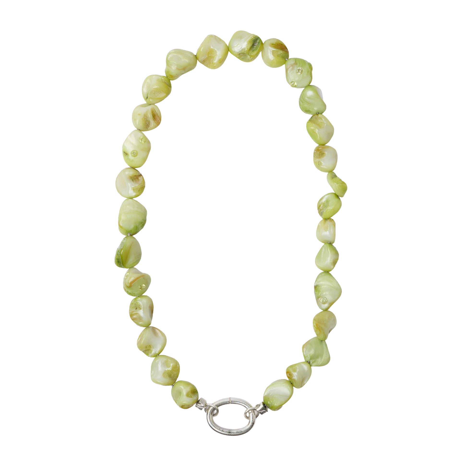 Necklace made of natural green river pearls, strung on a stainless still thread with a silver carabiner ring. From our latest SS25 collection.