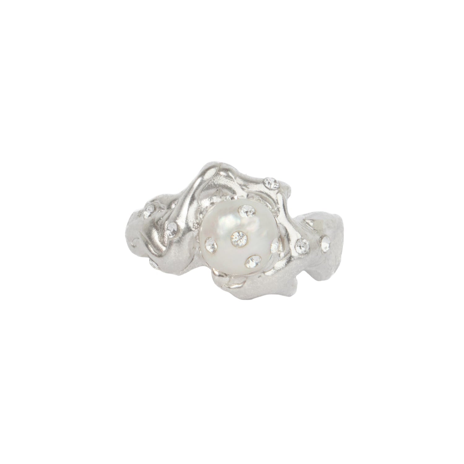 Thin elegant ring with a fresh-water pearl encrusted with little sparkling zirconias. From the SS25 collection.
