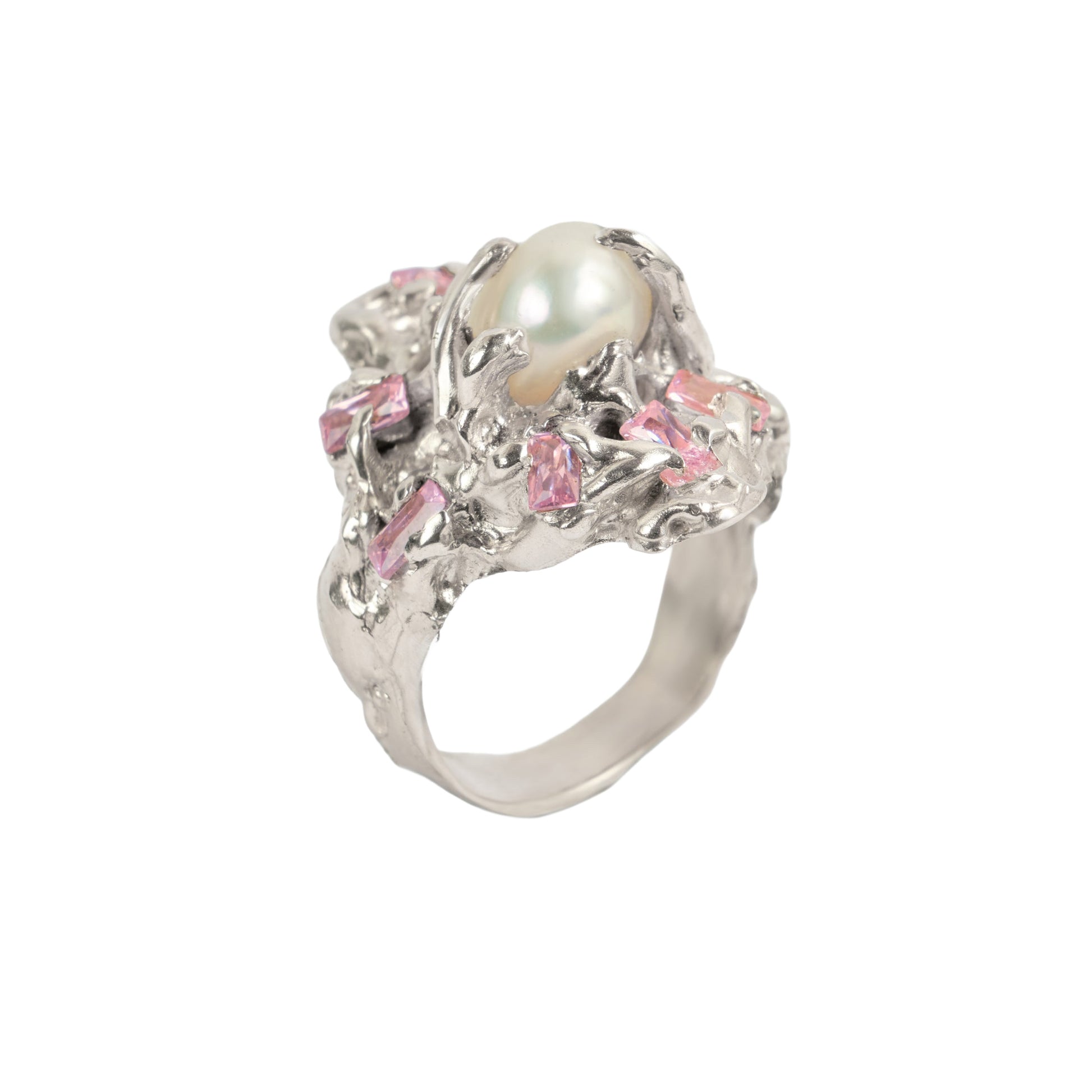 RSPZ09 // Silver monster ring with natural assymetric pearl and dusty pink zirconias