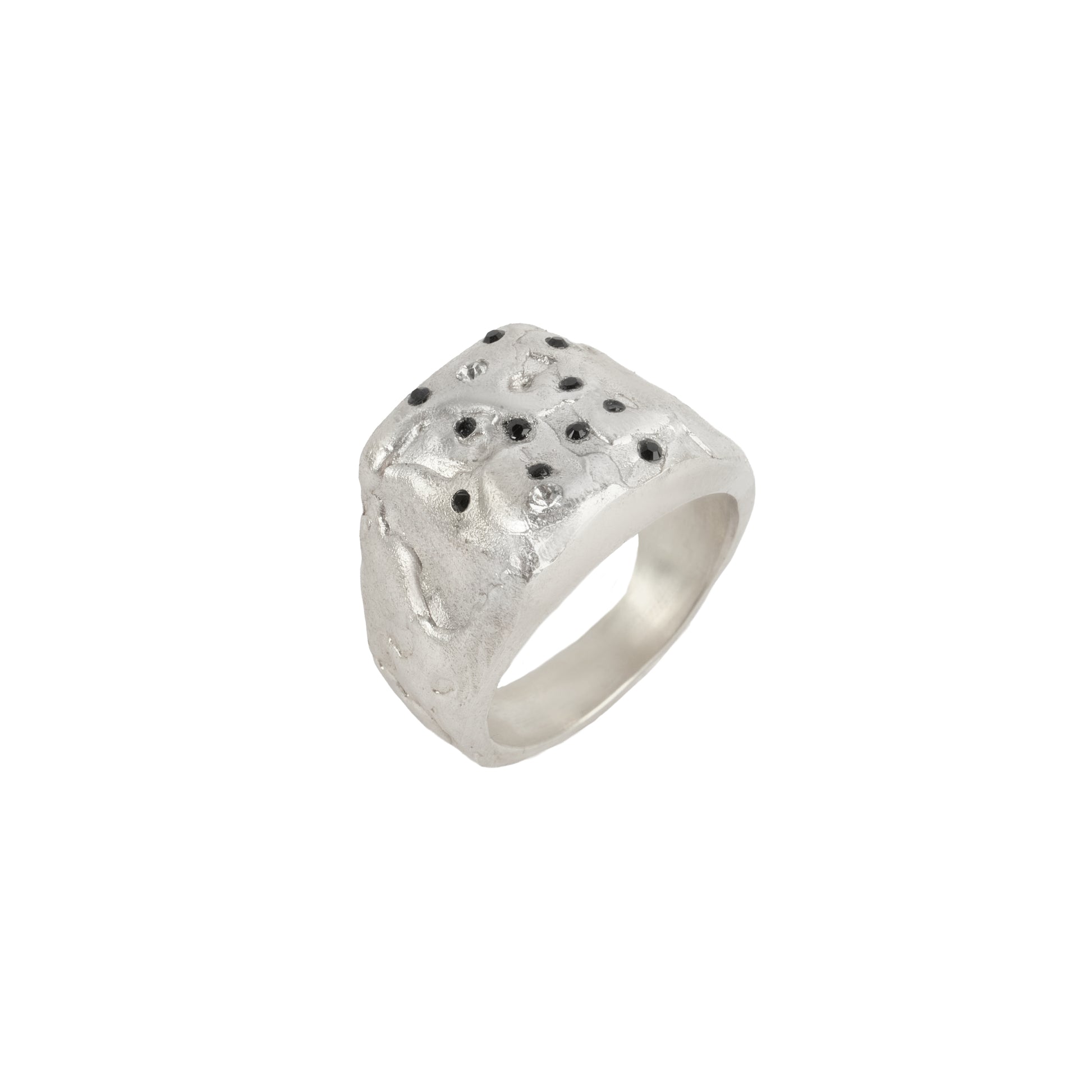 Silver signet ring made specifically for pinky fingers. Simple shape, but with a quirk. The ring is in matte finish and features multiple Swarovski stones. From the SS25 collection.