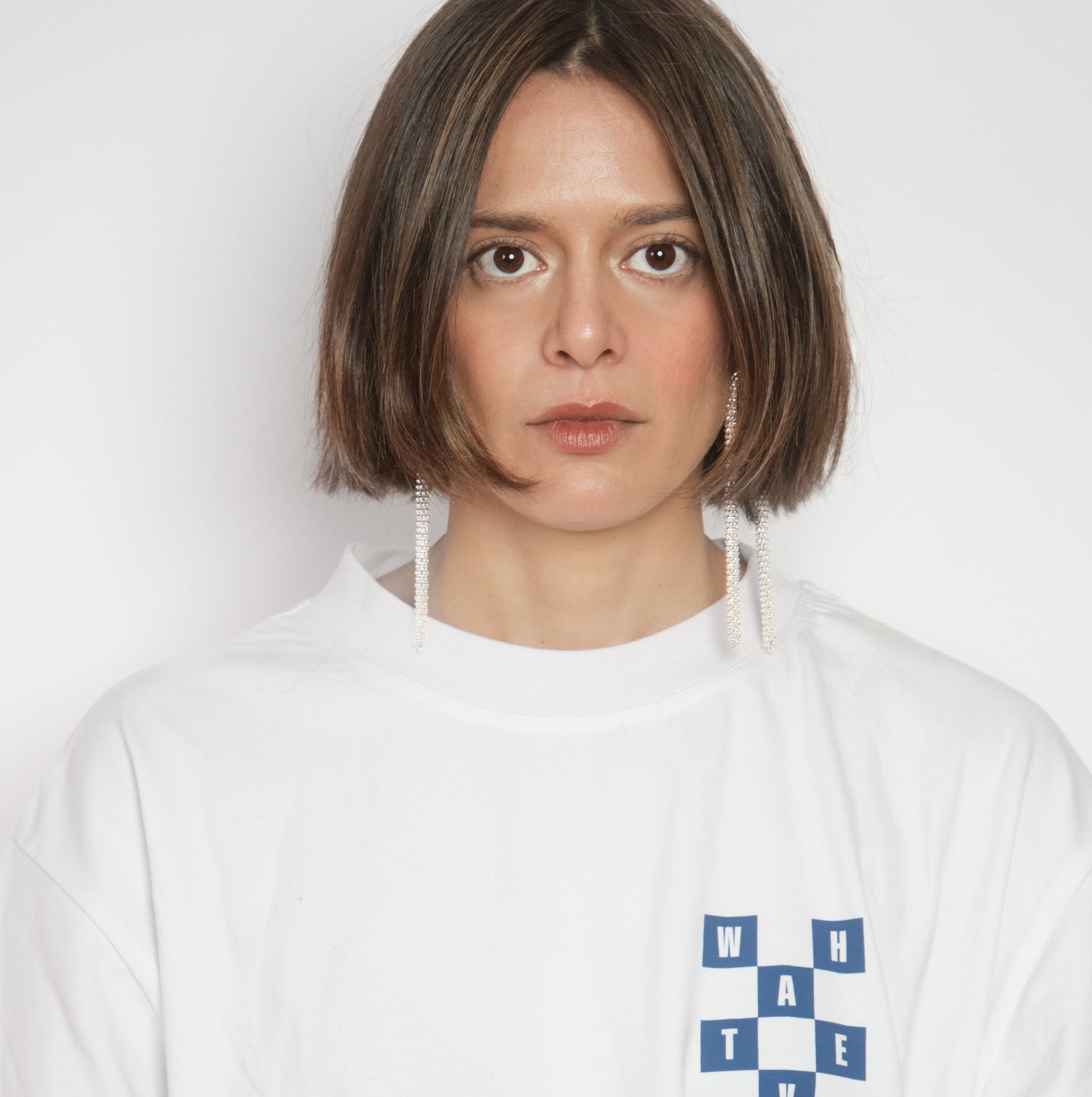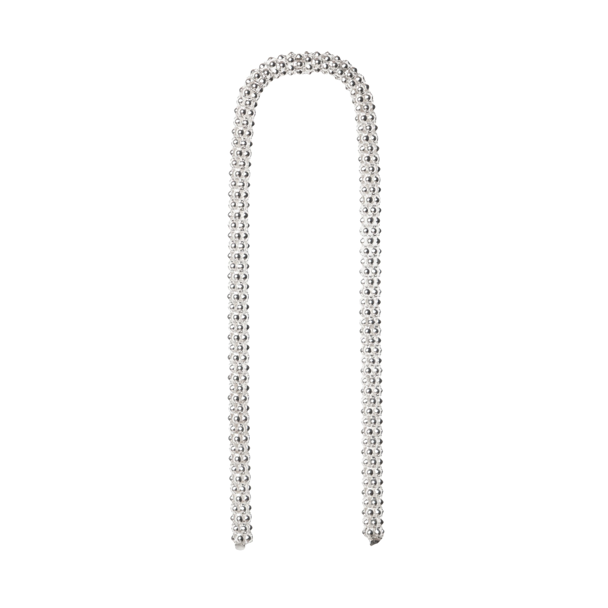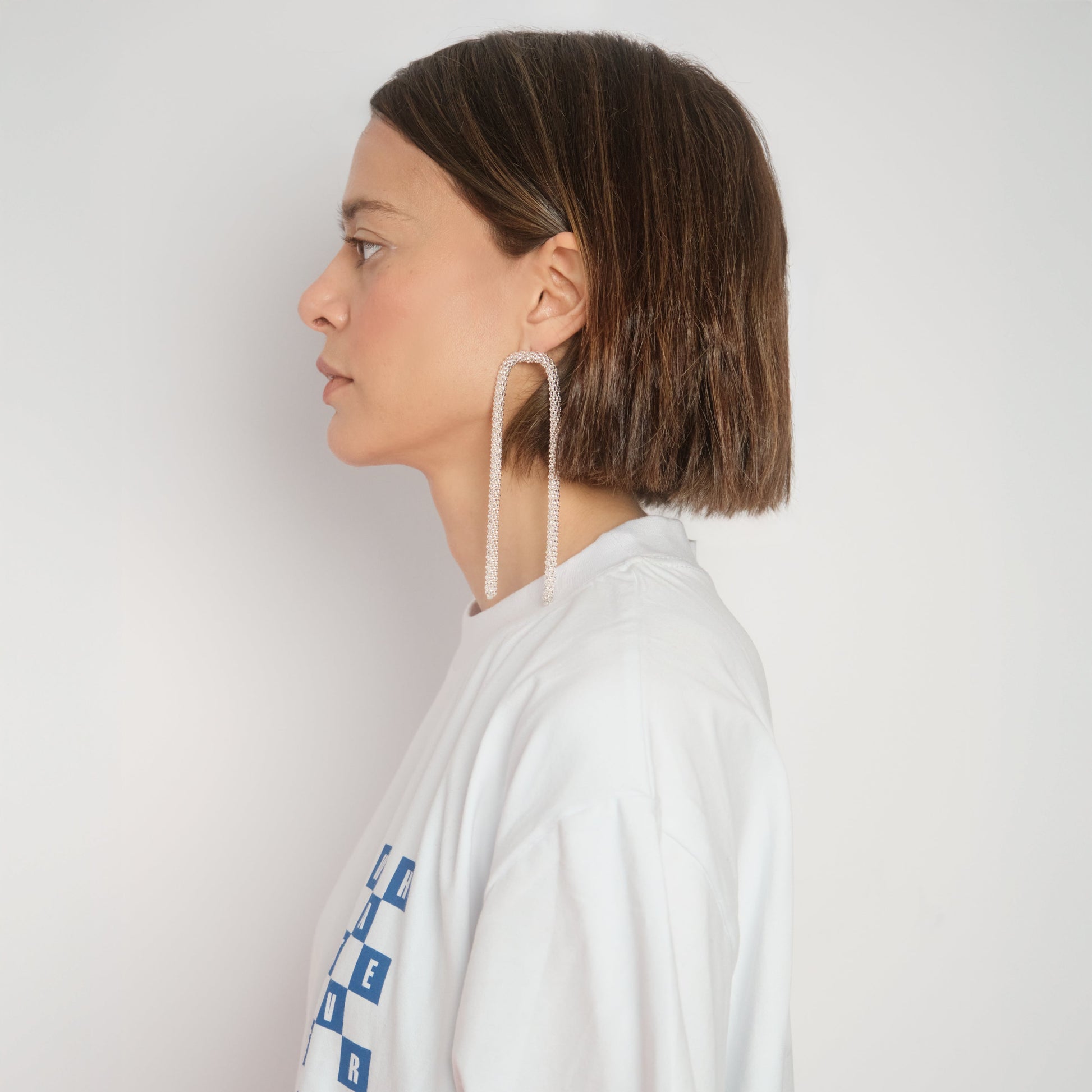 A mismatched pair of ultra-long silver chain earrings. Each earring has a different silhouette, adding subtle asymmetry and movement.